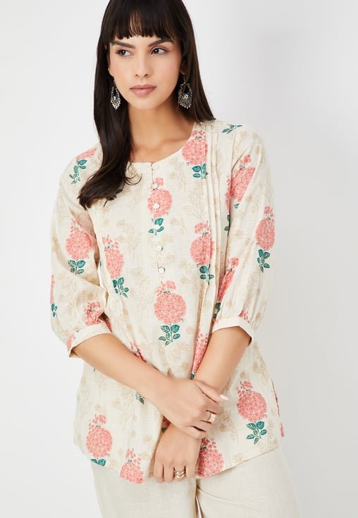 The intricate floral pattern is the highlight of this kurti, adding a touch of femininity and charm. The carefully chosen colors complement the natural aesthetic, making it a standout piece for any season.